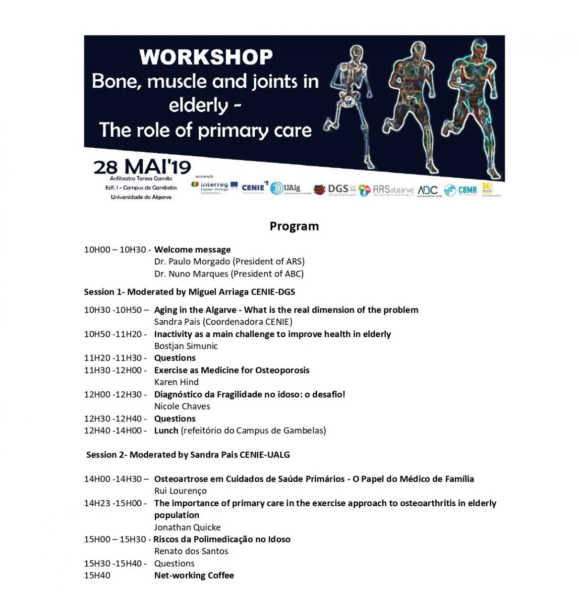 Primary care, has a huge role in the management of chronic diseases in elderly and in the prescription and orientation to exercise in order to improve functional, increase strength and muscular mass and decrease joint pain. The role of health care professionals in motivating patients to be more physically active has been recognized. The workshop promoted by the CENIE Project, ARS_Algarve and ABC, has the aim to share best practices regarding exercise and the management of Osteoarthritis and sarcopenia. How can health professionals and medical doctors motivate patients do improve their adherence to exercise.