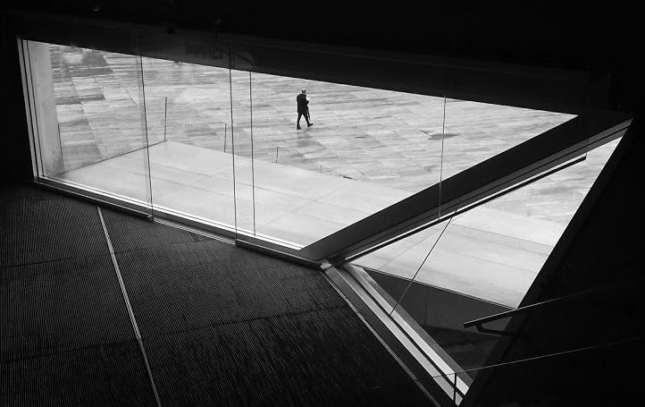 This photograph has been chosen as the winner of the CENIE Gran Prize for its geometry, cleanliness and dynamism. The triangular lines that form the architecture make the viewer focus on the space and the silence. The human being in the background, who moves away, gives us a sensation of softness due to the different lights that are turned off at the same time as leaving the image open to free interpretation. It is a photograph that anyone would like to take with their camera, because of its delicacy.