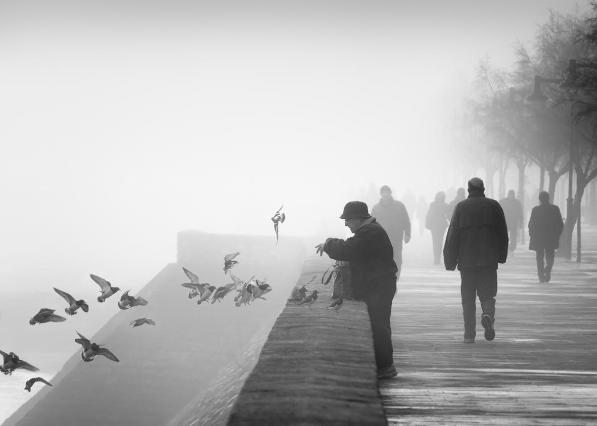 With the strength of the fog, delimited by the intensity and dimension of the greys, we can enjoy the scene of this character feeding the birds, while the rest of the people get lost in the infinite.