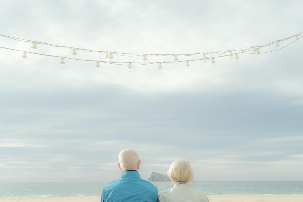 The atmosphere in soft tones, blue and white, provokes a sensation of well-being, quietness and serenity. A couple looks at the wide horizon on which an island can still be reached, while above them the garlands of lights speak of life still being a sweet celebration.