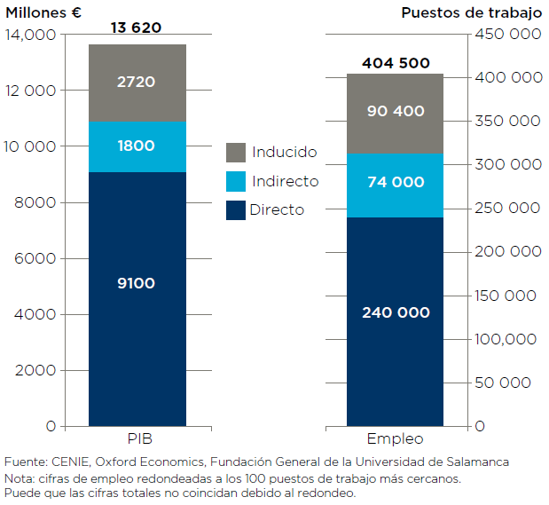 De los 13.620 millones de euros de valor añadido al PIB de la región generado por la actividad económica relacionada con los mayores de 50 años en Castilla y León, 9.100 corresponderían a lo generado por las empresas que suministran bienes y servicios (impacto directo), 1.800 millones de euros al valor añadido derivado de las actividades de compra de las empresas que suministran directamente bienes y servicios, así como de la actividad posterior en las cadenas de suministro de estas empresas (impacto indirecto) y 2.720 millones corresponderían al gasto salarial de los trabajadores empleados por las empresas que suministran directamente bienes y servicios, así como del gasto salarial de los empleados de sus cadenas de suministro (impacto inducido).