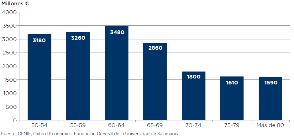 El estudio señala que, en 2021, los mayores de 50 años -alrededor de 1,1 millones de personas-, realizaron un gasto 17.800 millones de euros. Esta cifra supondría un gasto por persona de 16.800 euros. Este dato contrasta con los 13.100 euros de media de los residentes de entre 25 y 49 años. La mayor proporción del gasto de los mayores de 50 años se destinó a la vivienda, los servicios públicos y el combustible, con más de un tercio del gasto. “De todos los grupos de edad mayores de 50 años, los que tienen entre 60 y 64 años representan la mayor parte de los bienes y servicios adquiridos. La cohorte de 60 a 64 años gastó cerca de 3.480 millones de euros en 2021, lo que supone el 20% de todo el gasto de los mayores de 50 años”, según se explica en el informe. Esto último, equivale a unos 19.400 euros per cápita, un 50% más que el gasto medio de los residentes en el grupo de edad de 25 a 49 años.