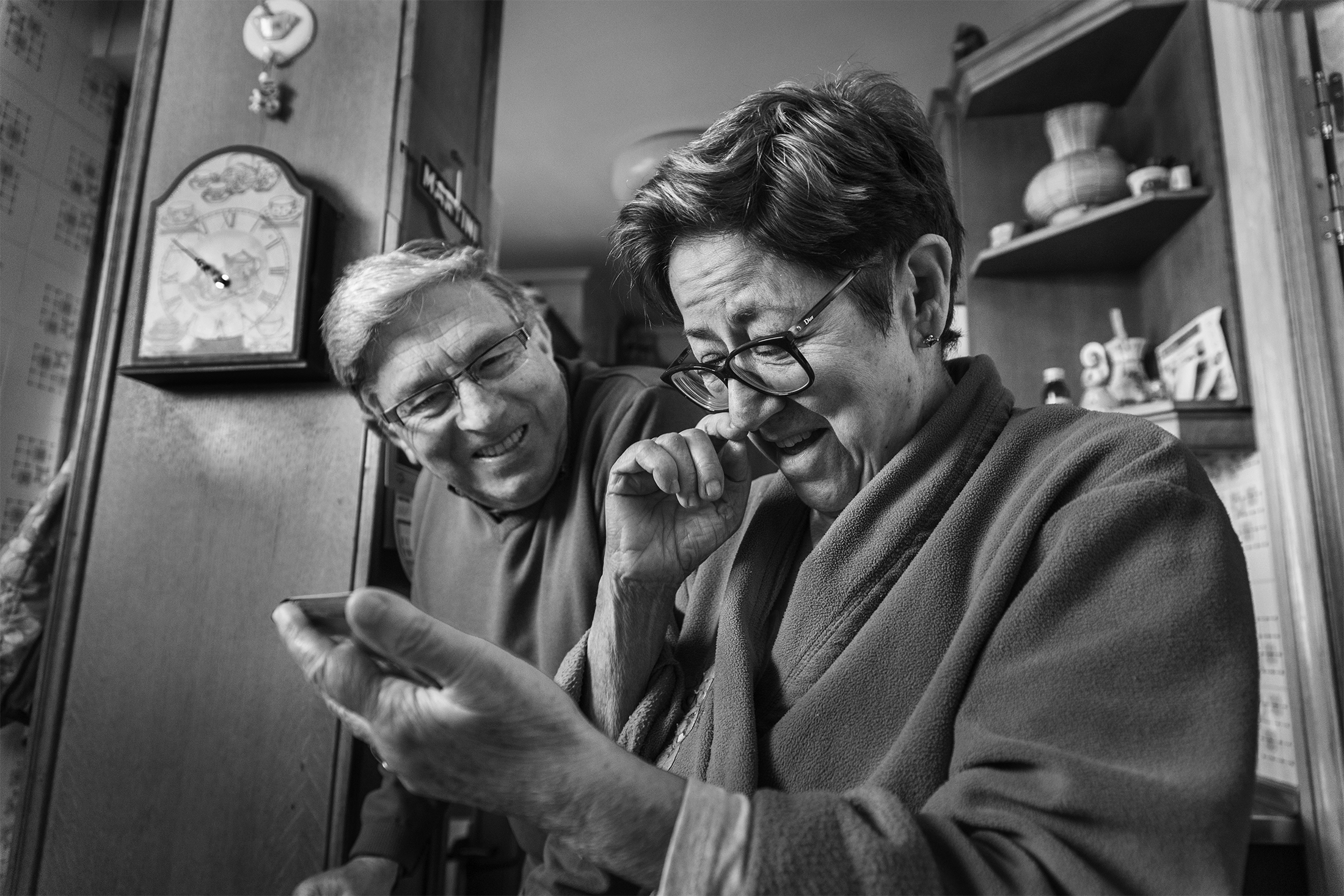 Chus y Paco se ríen mirando uno de los mensajes graciosos de whatsapp que tanto llegan durante estos días. El teléfono móvil que miran es el de Chus, ya que Paco no tiene móvil, nunca ha querido tener uno.
