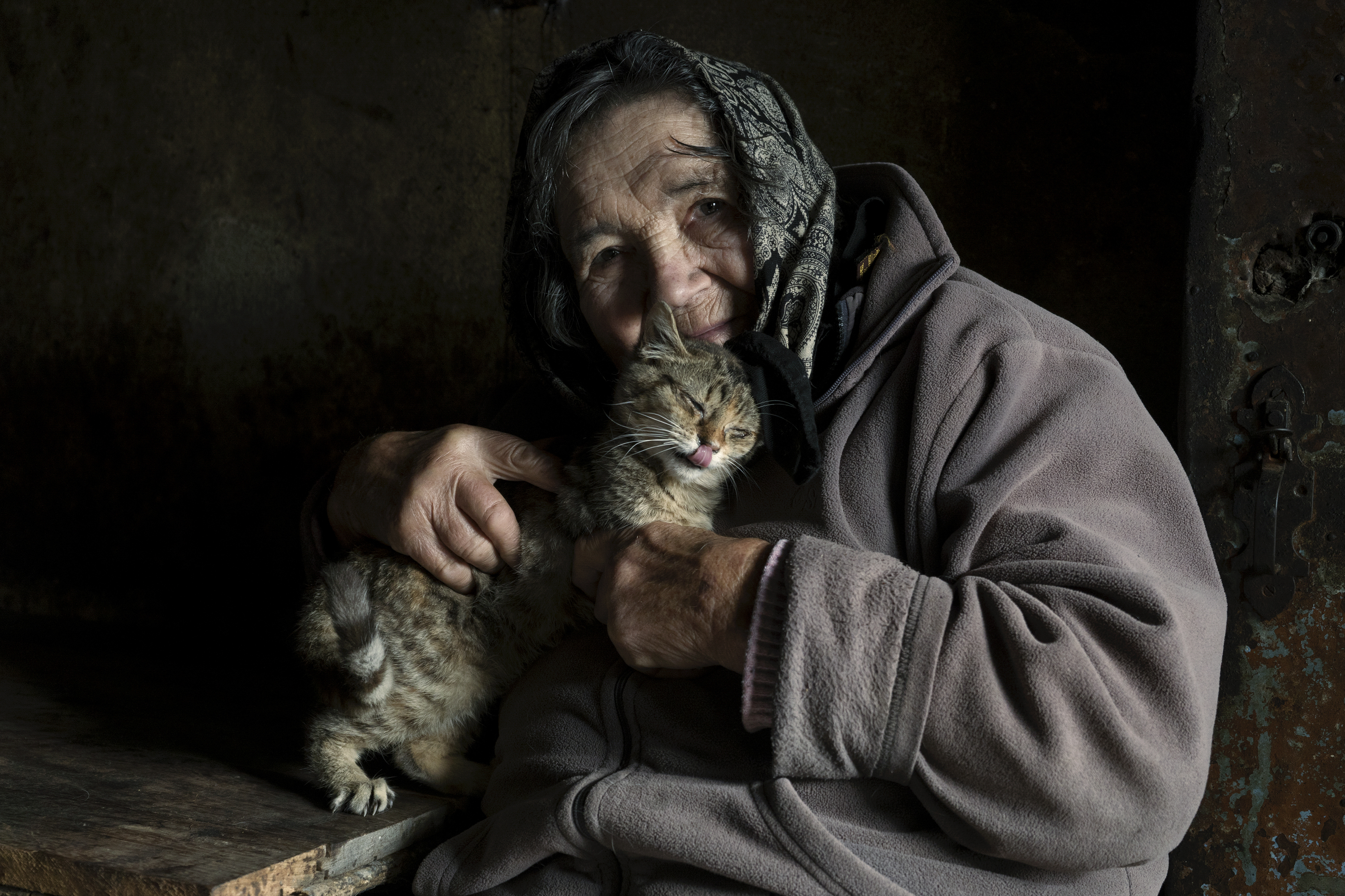 A Albina Ruela, agricultora de 85 anos, na companhia do seu gato Riscas.