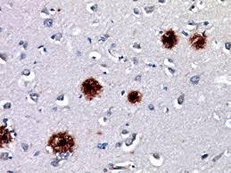 Depósitos extracelulares en la sustancia gris del cerebro formados por neuronas muertas, otras células cerebrales y fragmentos de proteínas tóxicas, conocidos como beta amiloide, que se relacionan con procesos de envejecimiento y de degeneración neuronal.
