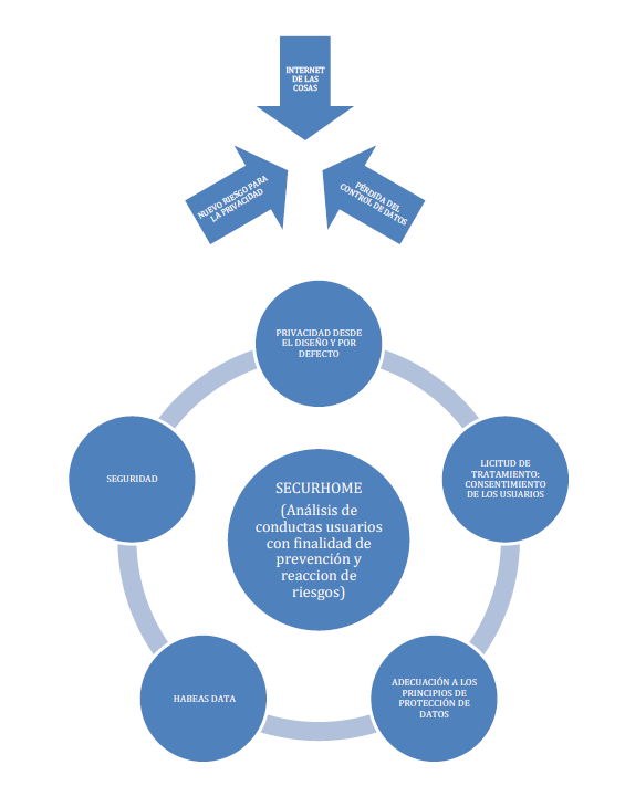 Para desarrollar el Dispositivo SECURHOME es necesario recoger datos personales, es decir, informaciones sobre una persona física identificada o identificable que servirán para estudiar las conductas de los usuarios del dispositivo y de esta forma poder detectar alteraciones en esas conductas para prevenir y reaccionar ante cualquier eventualidad. Esta recogida y análisis de la información personal constituye un tratamiento de datos personales según la definición del artículo 4 del RGPD y nuestro trabajo de investigación se centrará en identificar los requisitos legales aplicables a dicho tratamiento de datos. Esta labor, entre otras cuestiones, exigirá determinar la naturaleza y categoría de los datos personales recabados, la finalidad o finalidades compatibles de uso de esos datos, las condiciones para el consentimiento de las personas titulares de los datos personales y las medidas de seguridad aplicables. Este último aspecto, el de la seguridad, resulta de vital importancia en el ámbito del Internet de las cosas, en el que la evaluación de los riesgos inherentes al tratamiento de datos personales se presenta como un requisito previo imprescindible.
