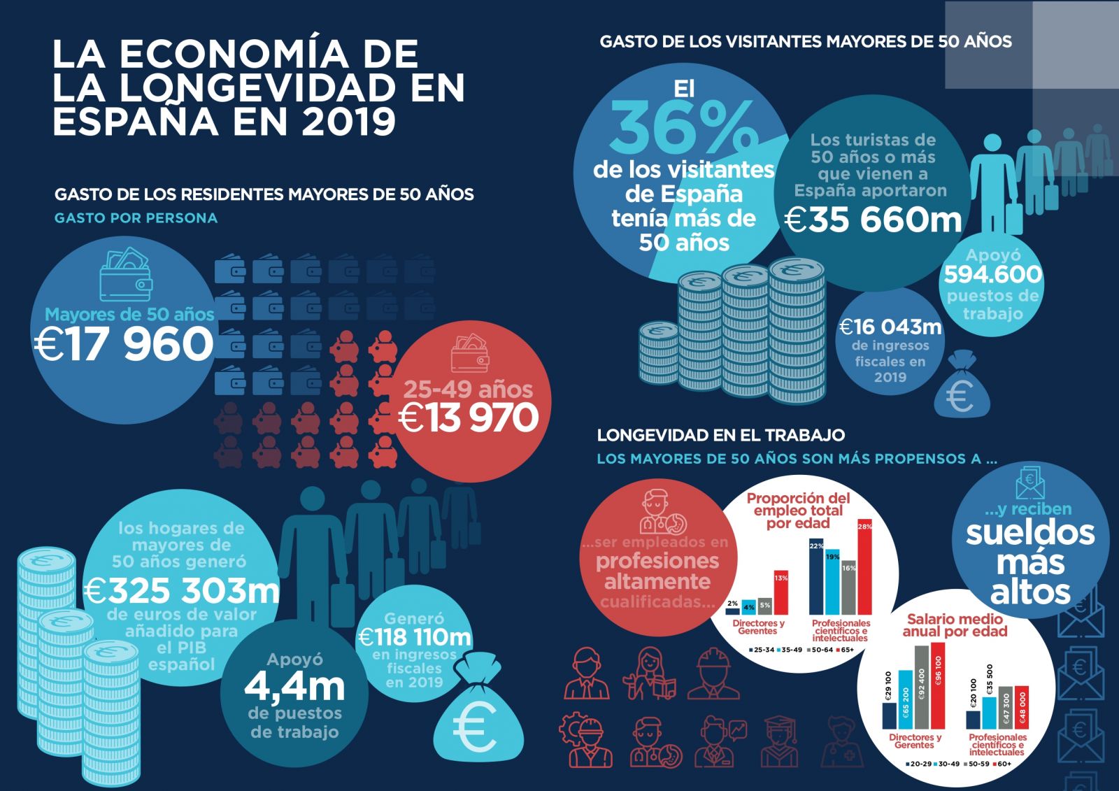 El estudio señala que, en 2019, los mayores de 50 años, alrededor de 18,6 millones de personas, realizaron un gasto 334.942 millones de euros, lo que equivale al 60% del total del gasto de la población española. Esta cifra supondría un gasto por persona de 17.960 euros. Este dato contrasta con los 13.970 euros de media de gasto por persona de los residentes en España con edades comprendidas entre los 25 y 49 años, (alrededor de 16,4 millones), que sumaron un gasto total de 229.700 millones de euros. El mayor gasto se encuentra en el rango de población de 50 a 59 años (140.004 millones de euros), seguido por los comprendidos entre los segmentos de edad de 60 a 69 (98.462 millones de euros), 70 a 79 (64.417 millones de euros) y finalmente los mayores de 80 (32.059 millones de euros). A esto hay que añadir que esta actividad económica supuso una contribución de 118.110 millones de euros en impuestos.