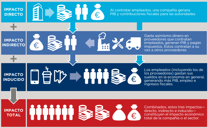 De los 325.303 millones de euros de valor añadido al PIB español generado por la actividad económica relacionada con los mayores de 50 años en nuestro país 170.505 corresponderían al valor añadido por la adquisición de bienes y servicios a las empresas españolas (impacto directo), 94.756 millones de euros, corresponderían al valor añadido derivado de la provisión de bienes y servicios a estas empresas (impacto indirecto) y 60.042 millones por el valor añadido de los salarios pagados por las empresas y su cadena de suministro, (impacto inducido). Este gasto acaba impactando en una gran variedad de sectores.