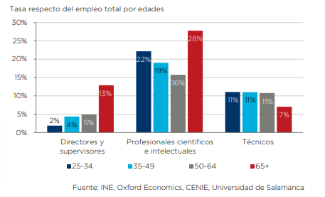 Además, el estudio constata que los trabajadores mayores de 50 años ocupan proporcionalmente puestos de mayor relevancia. De hecho, un 5% del grupo de personas con edades entre 50 y 64 años ocupan puestos de alto nivel, frente al 4% de entre 25-49 años, mientras que un 13% de mayores de 65 años ocupan esta misma categoría de empleos.