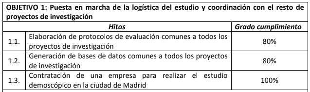 En la siguiente tabla se enumeran los objetivos de MADRID+90, se resumen brevemente los hitos asociados a cada uno de ellos y se cuantifica el grado de cumplimiento actual.