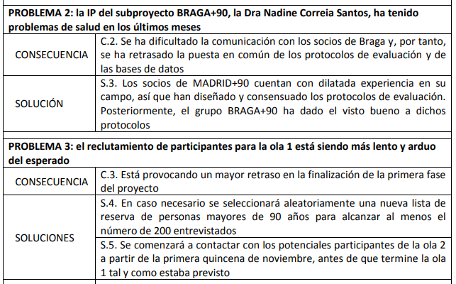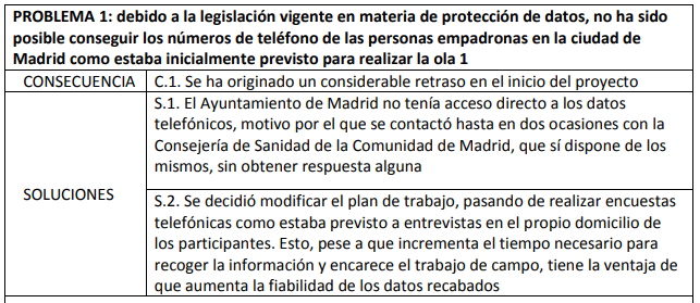Durante la ejecución del plan de trabajo inicialmente previsto han concurrido una serie de incidencias a las que el equipo investigador ha tenido que dar respuesta para poder cumplir con los objetivos de MADRID+90. Dichas incidencias, así como las consecuencias que han provocado y las acciones que se han llevado a cabo para superarlas, se resumen en la siguiente tabla: