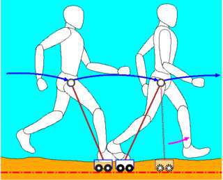 Figura 2: línea roja que muestra el péndulo invertido como modelo de un bípedo que caminado. (ilustración de http://www.mi.ams.eng.osaka-u.ac.jp/member/sugihara/research2009-e.html)