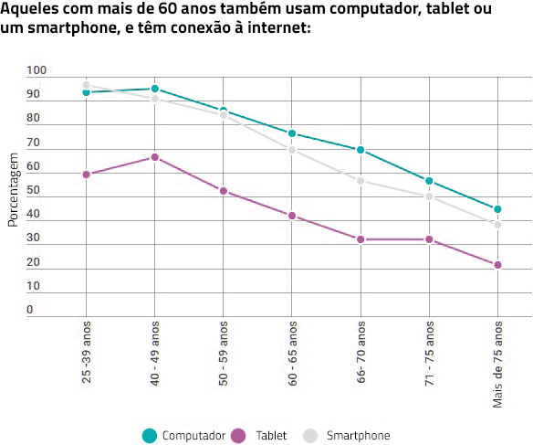 Pessoas com menos de 60 anos têm ampla disponibilidade de computadores, telefones inteligentes e conexões à Internet. No entanto, é após os 70 anos, quando a disponibilidade cai mais abruptamente. Existe uma relação direta entre ter um computador e ter uma conexão à internet e essa relação é válida para adultos tanto com mais como com menos de 60 anos de idade.