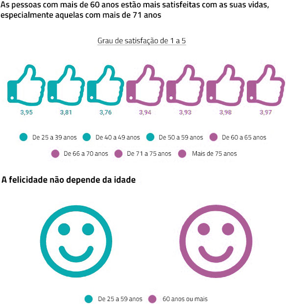 As pessoas com mais de 60 anos estão mais satisfeitas do que as mais jovens com a vida em geral e as conquistas das suas vidas. Especificamente, os mais satisfeitos com as suas vidas são aqueles com mais de 71 anos e as pessoas menos satisfeitas as pessas entre os 50 e 59 anos de idade. Quanto à satisfação com as conquistas da sua vida, os mais satisfeitos são a faixa etária dos 66 e 70 e a faixa menos satisfeita a dos 40 a 59.